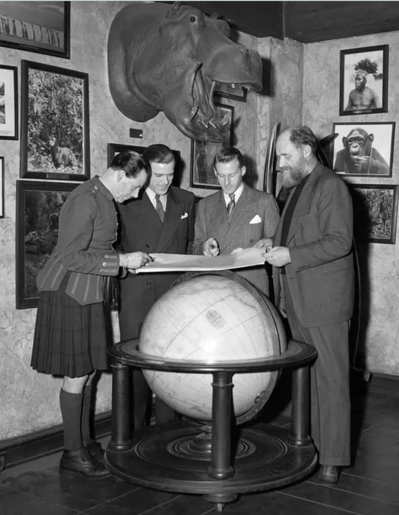 Photo on left (l-r): Seumas, the Chief of Clannfhearghuis of Strachur, Argyll, Scotland; Kon-Tiki crewmember Herman Watzinger along with Thor Heyerdahl; and Peter Freuchen. The globe was donated to the Club by the Chief in 1935; the photo was taken in 1947.