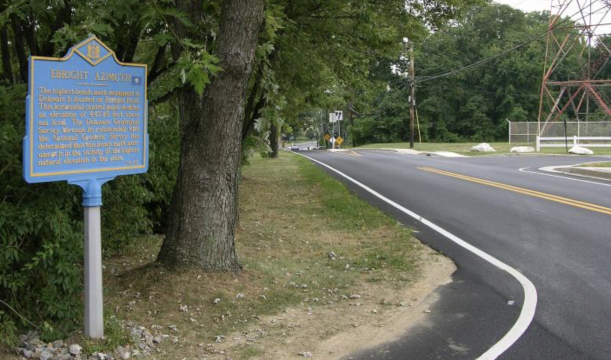 | | Easy, Peasy – One down, 49 to go. Delaware's highest point is the Ebright Azimuth, located in northern New Castle County near the Pennsylvania border (448 feet above sea level). It's known to Highpointers as an easily accessible "virtual drive-up" high point, visited by those seeking to reach all 50 state highpoints. | | |