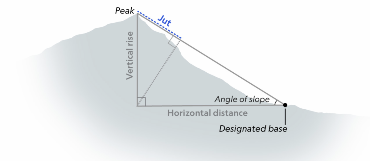 Jut considers both a summit's height above a lower point and the steepness of the angle between them. The highest possible version of that number – out of all the possible points where it could be measured – is a mountain's jut.