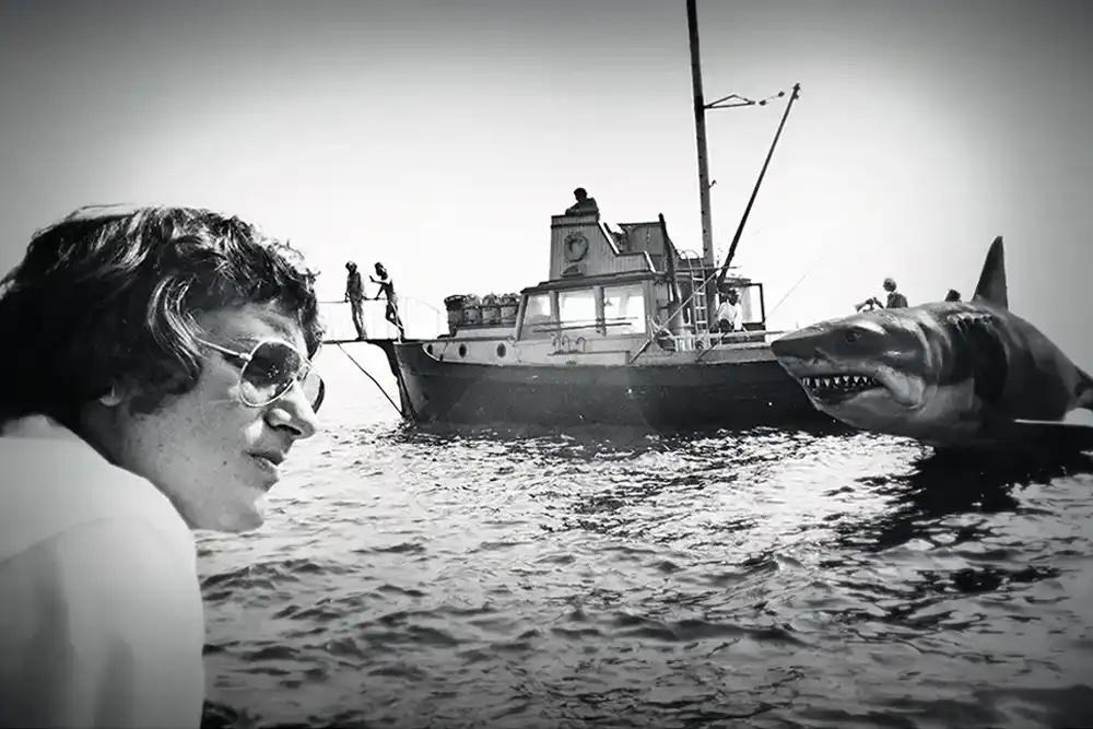 | | Director Steven Spielberg on the set of Jaws with the mechanical shark – “Bruce” – in the background. The boat also played a starring role. (Photo: Universal Studios) | | |