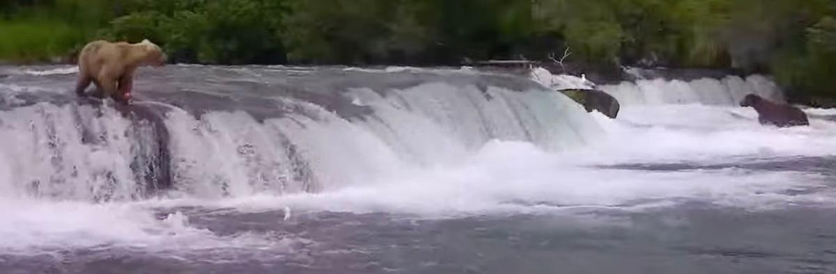 Screenshot of Brooks Falls brown bears as they fish for migrating salmon in Katmai National Park and Preserve on the Alaska Peninsula.